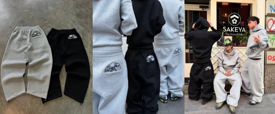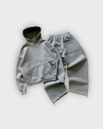 This heavyweight fleece tracksuit combines oversized comfort with bold street attitude. Featuring wide-leg sweatpants and a roomy hoodie, both pieces are finished with a graphic back-pocket patch for a standout look. Available in classic grey and black.