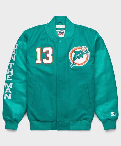 Introducing the HOMAGE x Starter Dan Marino “GOAT” Jacket – a tribute to a titan of sports history. This exclusive, limited-edition varsity jacket is crafted with unparalleled attention to detail, blending luxurious premium wool and supple leather.