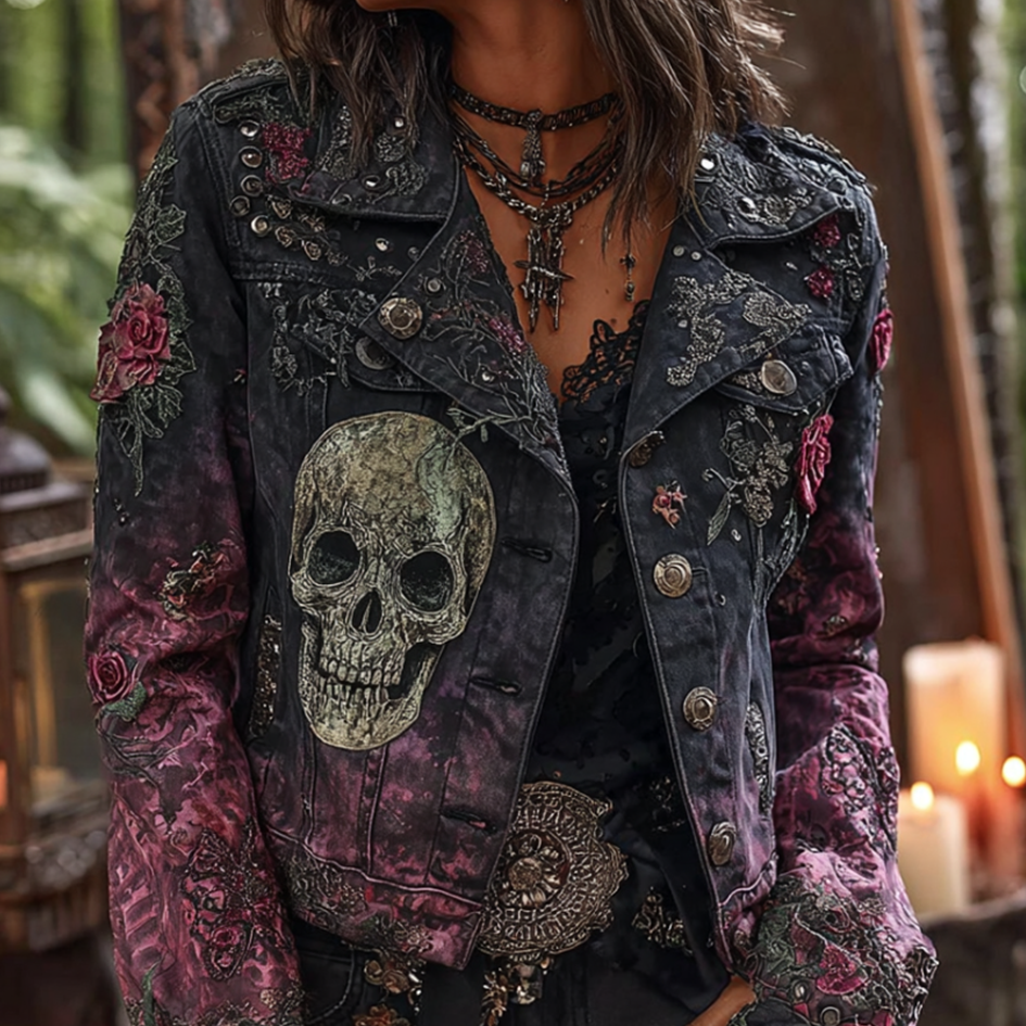 A Retro Women's Gradient Denim Jacket With Gothic Skull And Floral Elements Design For Halloween.