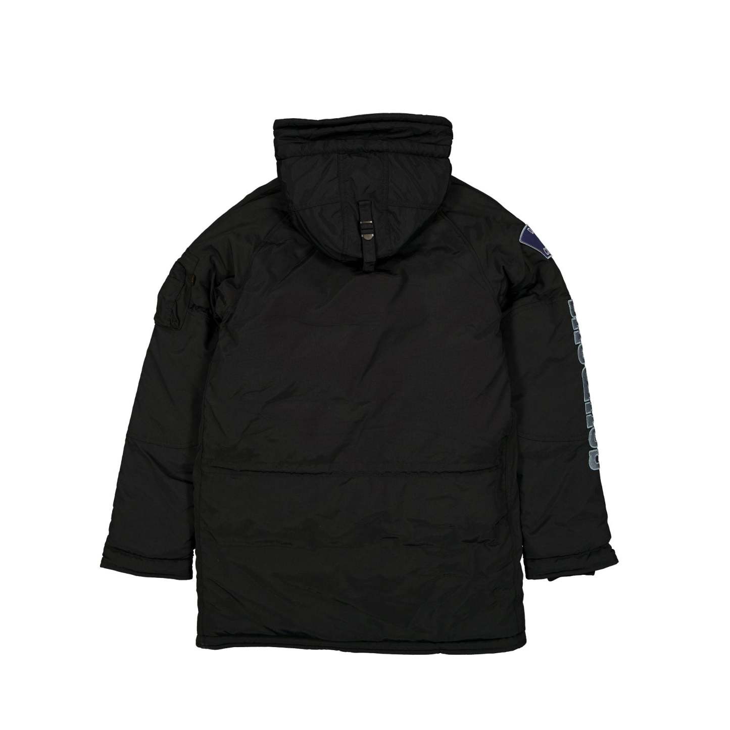 The Alpha Industries x Dallas Cowboys Black N-3B Parka Jacket features an embroidered Cowboys logo at the left chest with alternate team logos, an NFC logo, and a Super Bowl XXX patch at the front. Additional details include a Dallas Cowboys Est. 1960, National Football Conference World Champions script above the snap button closure pocket with a utility pocket with the signature Alpha Industries red ribbon at the left sleeve, a team wordmark and logo at the right sleeve. Further details include a full-zip, snap button closure at the front with a woven New Era Cap x Alpha Industries tag at the hem and New Era shoulder straps at the interior.
