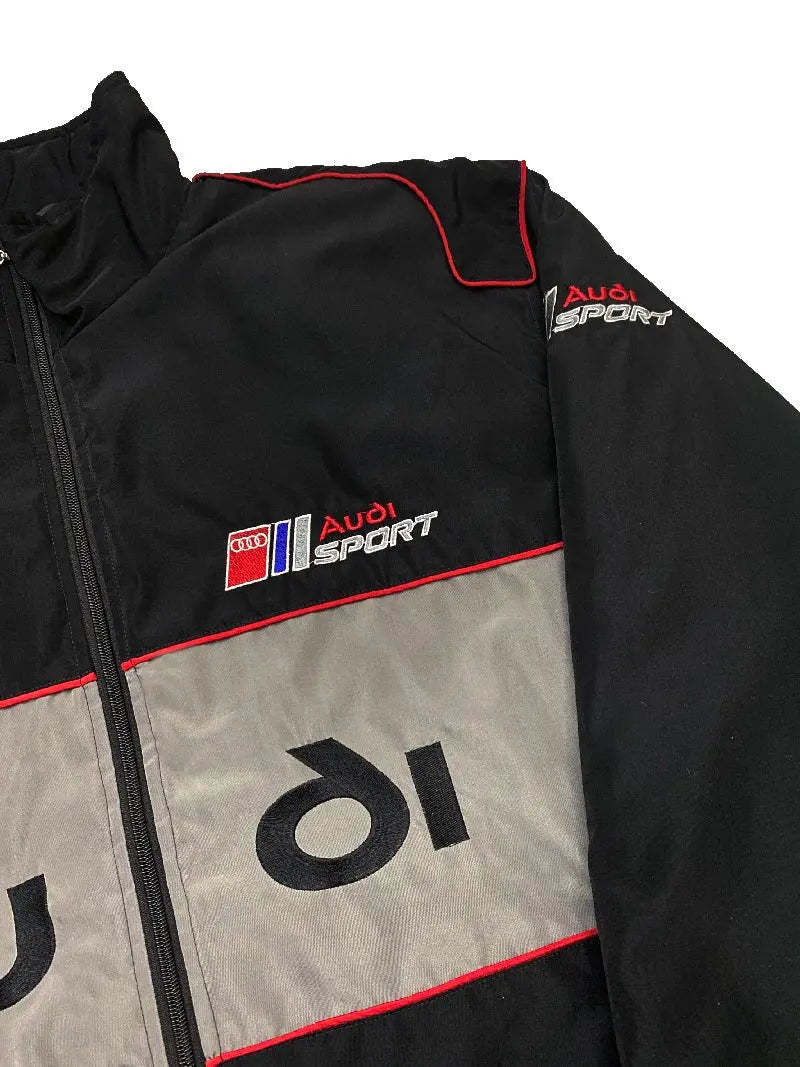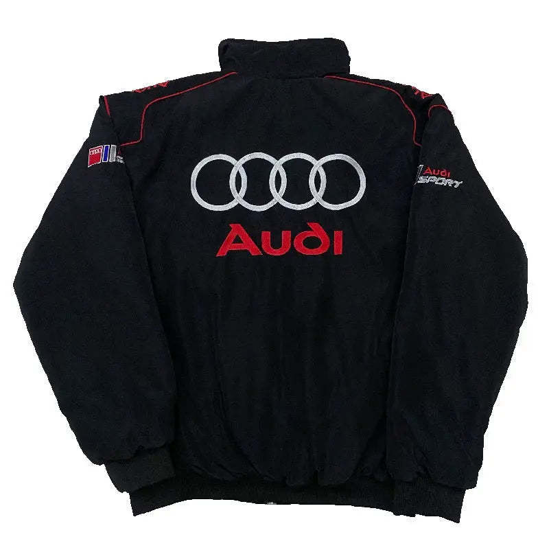 Classic Audi F1 racing jacket with iconic logos and a sleek black design. Features a zip-up front, high collar, elastic cuffs, and practical pockets. Perfect for motorsport fans and collectors.