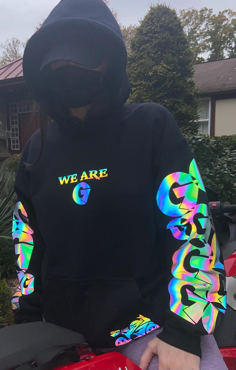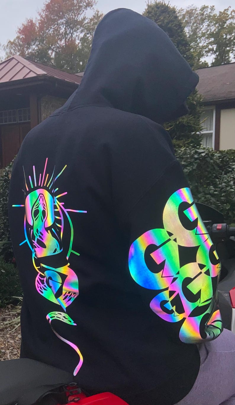 This hoodie features rainbow reflective designs strategically placed on the hoodie to make you visible from the front side and back.