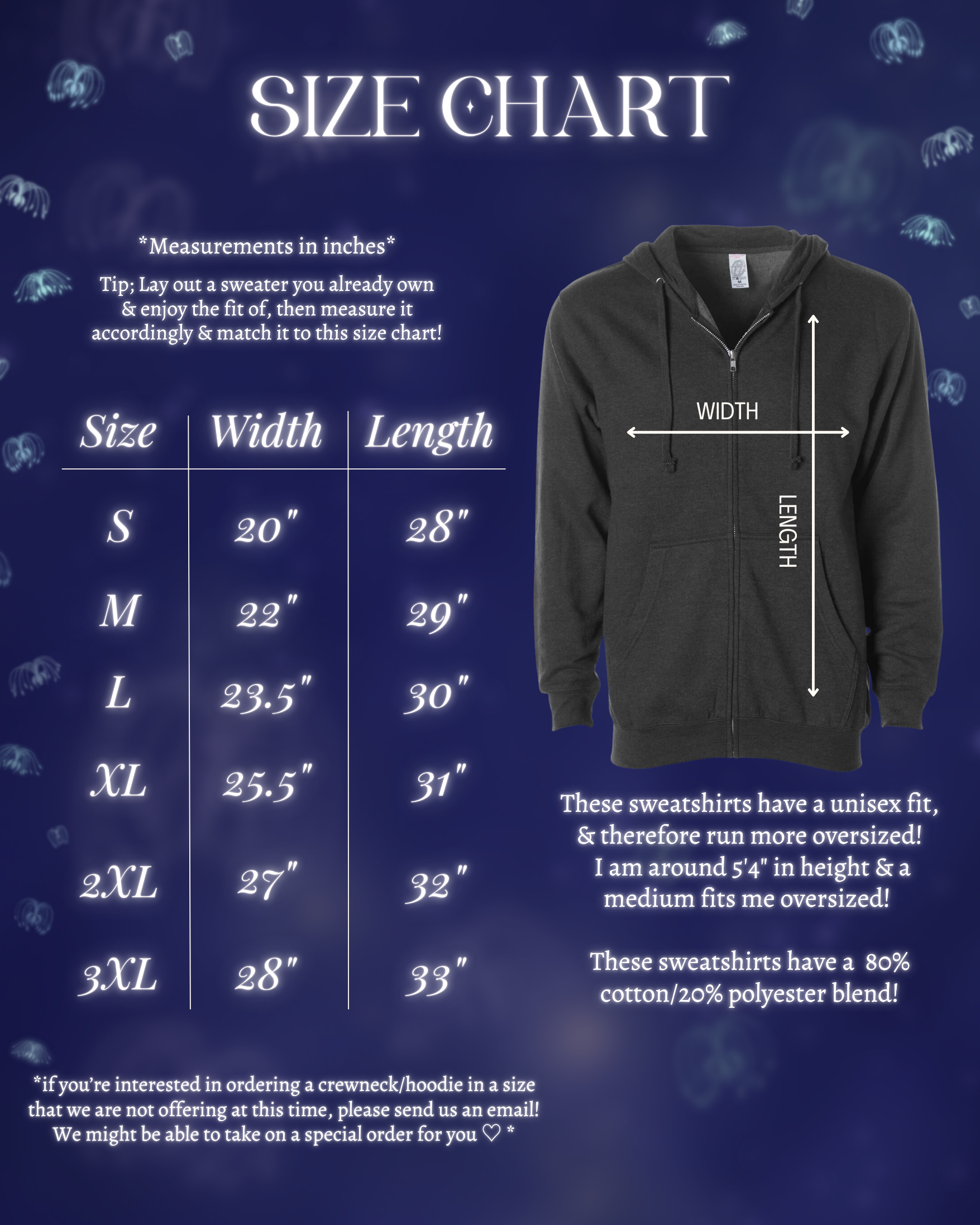 Please refer to the size guide before placing an order- we recommend comparing the measurements to a sweater that is in your closet currently. All sizes are unisex, but please feel free to reach out if you have any concerns or questions!