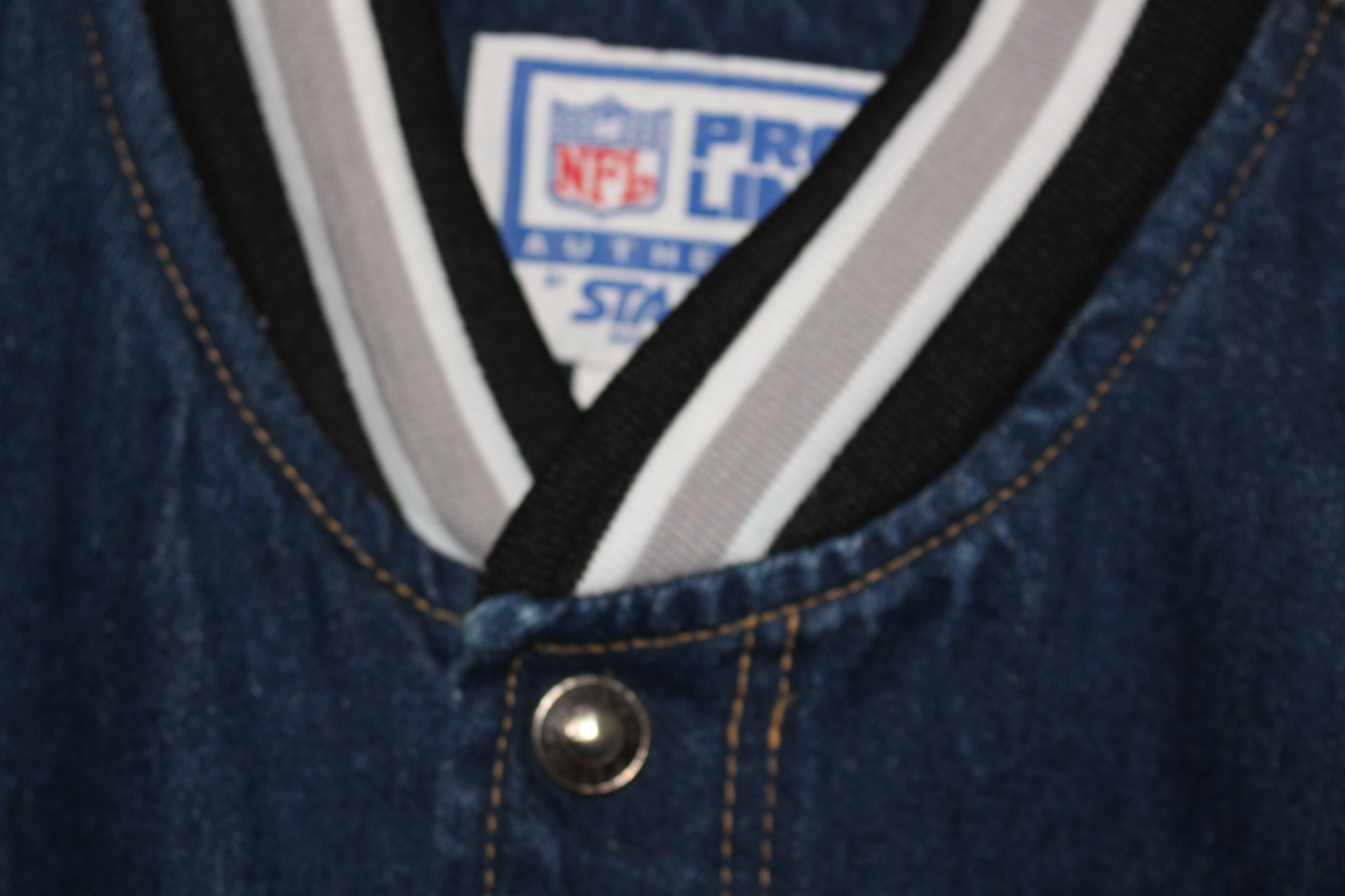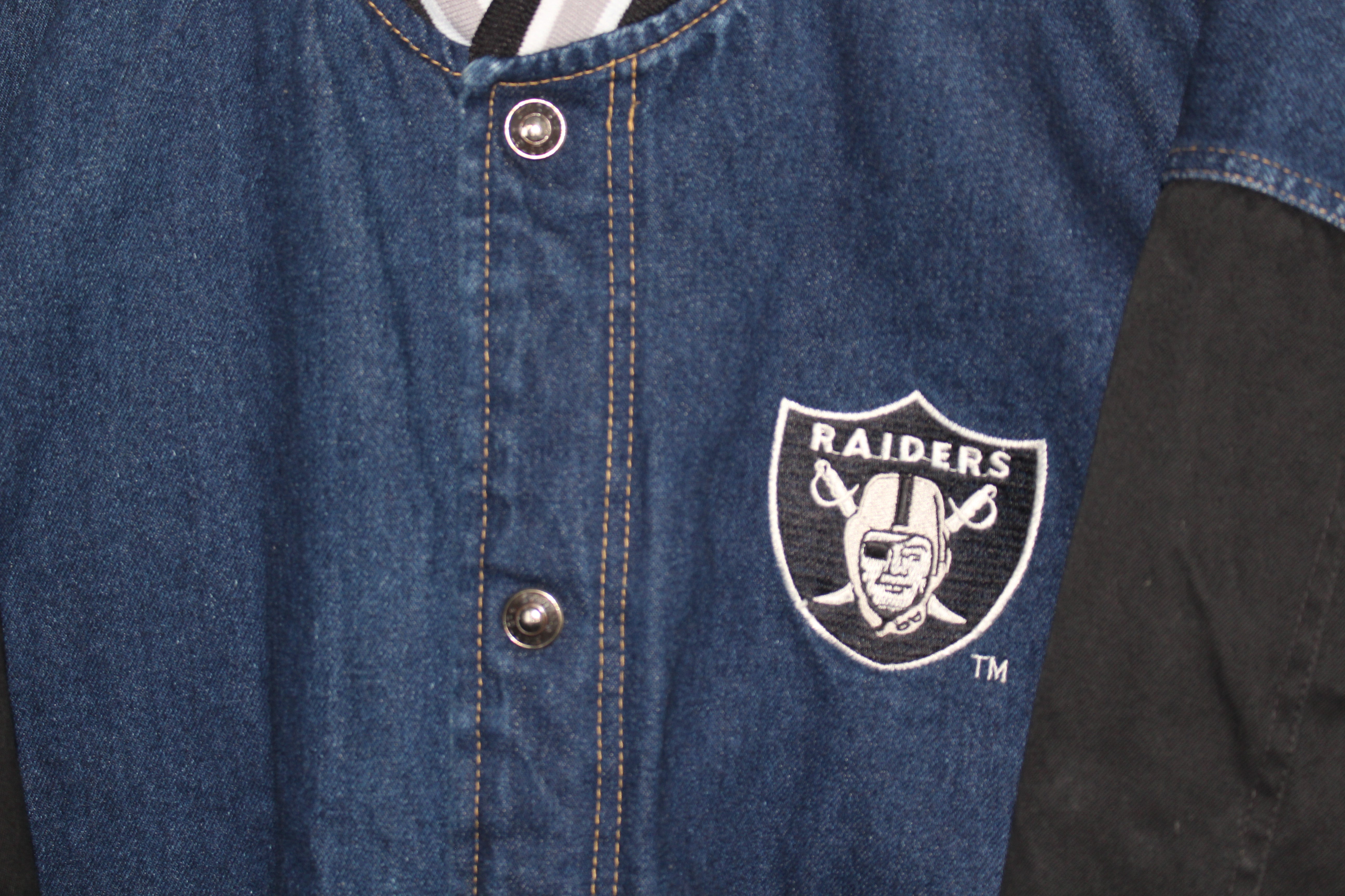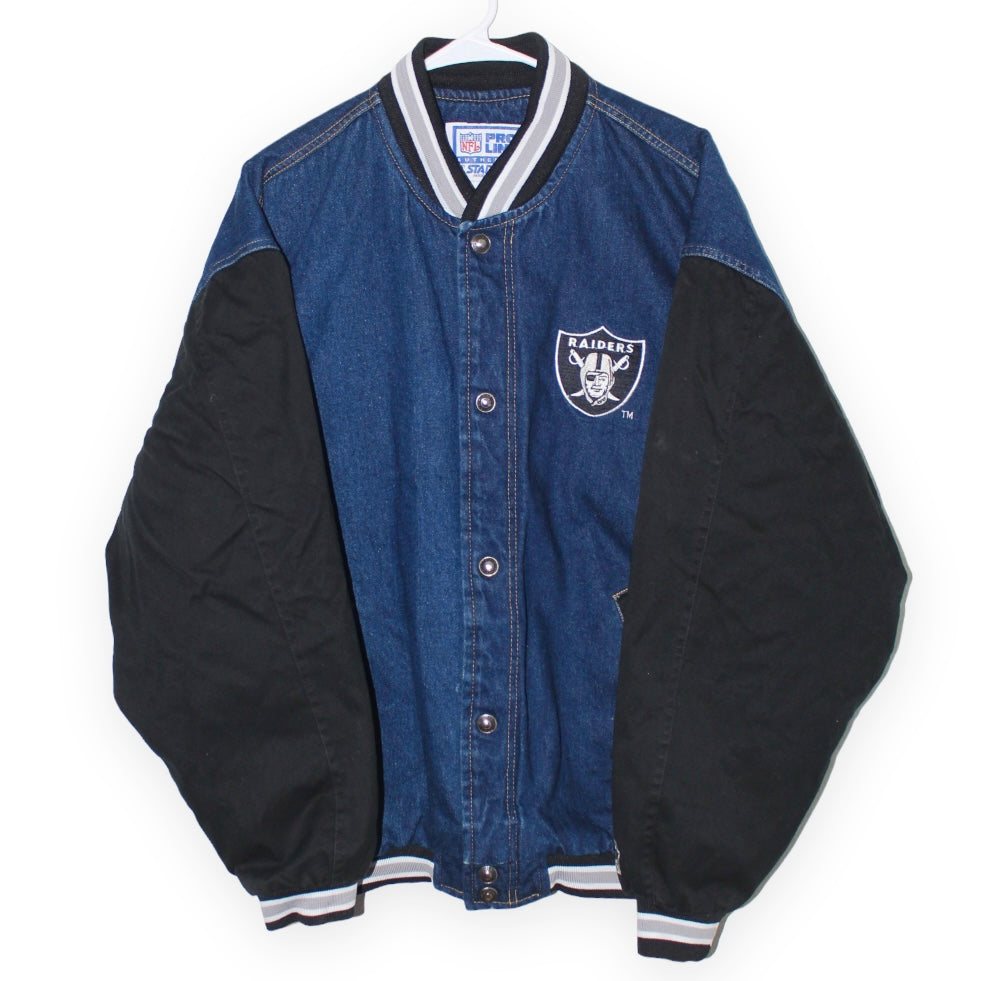 Rare Oakland Raiders Starter Denim Quilted Satin Lining Bomber Jacket (XL)