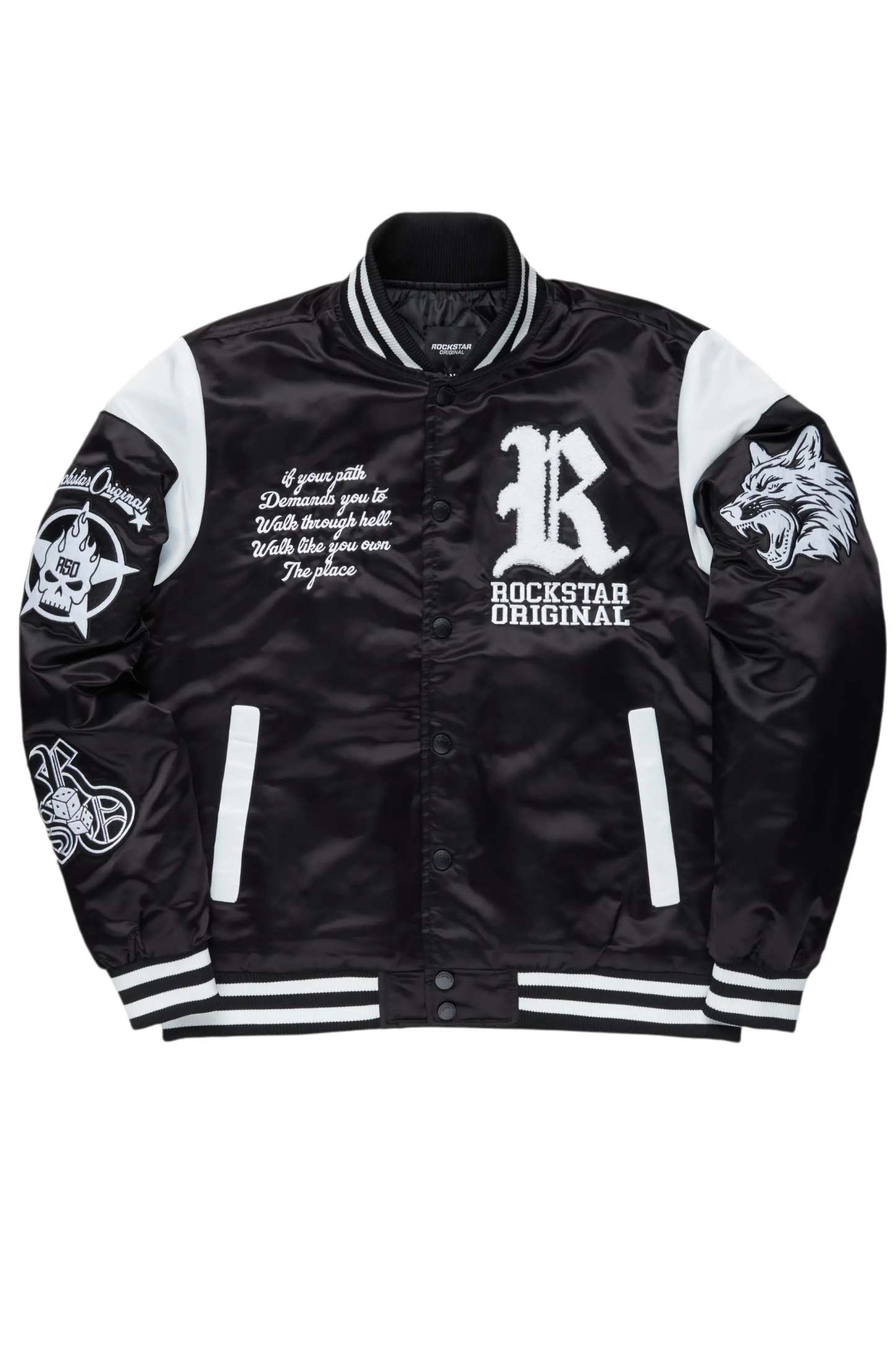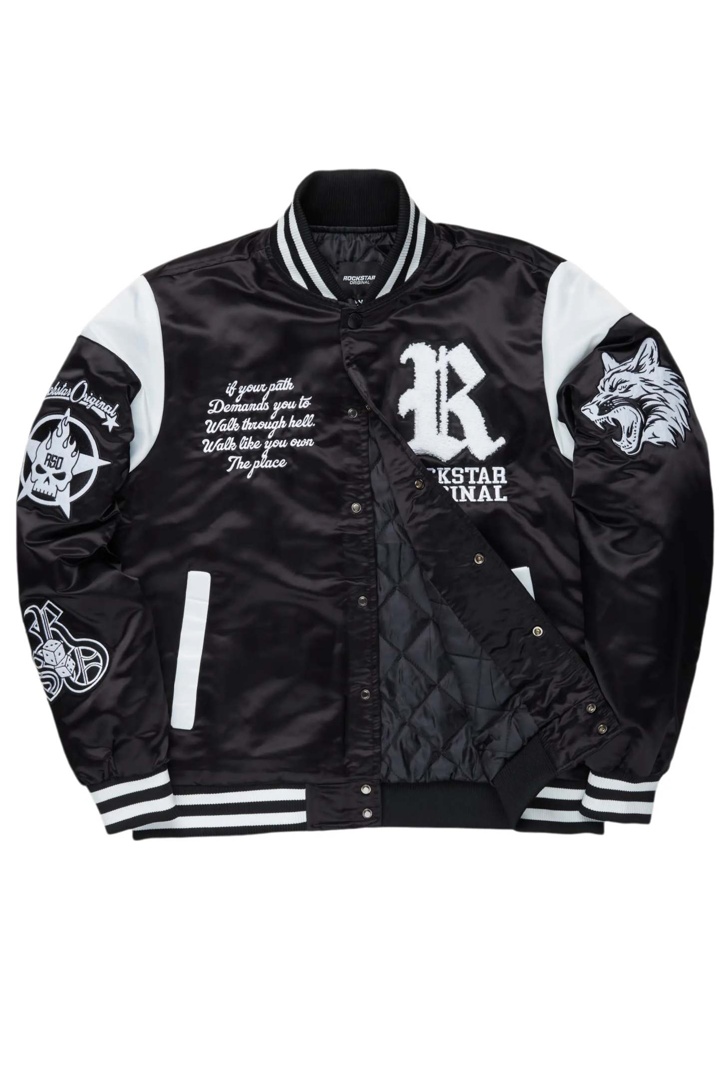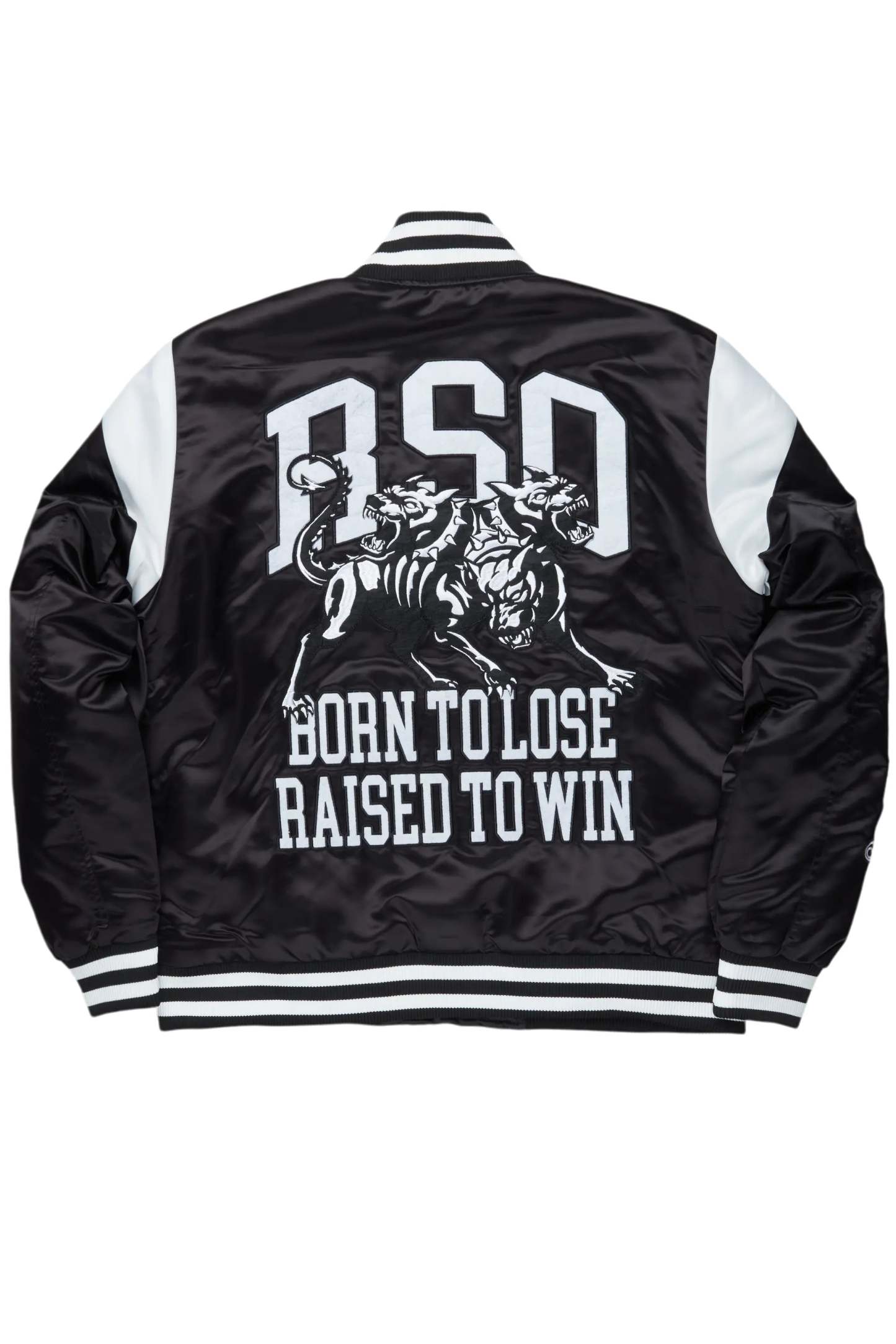 An urban collegiate varsity jacket for men in black. Designed with custom detailing and quilted construction for a dope flight-jacket inspired layering piece.