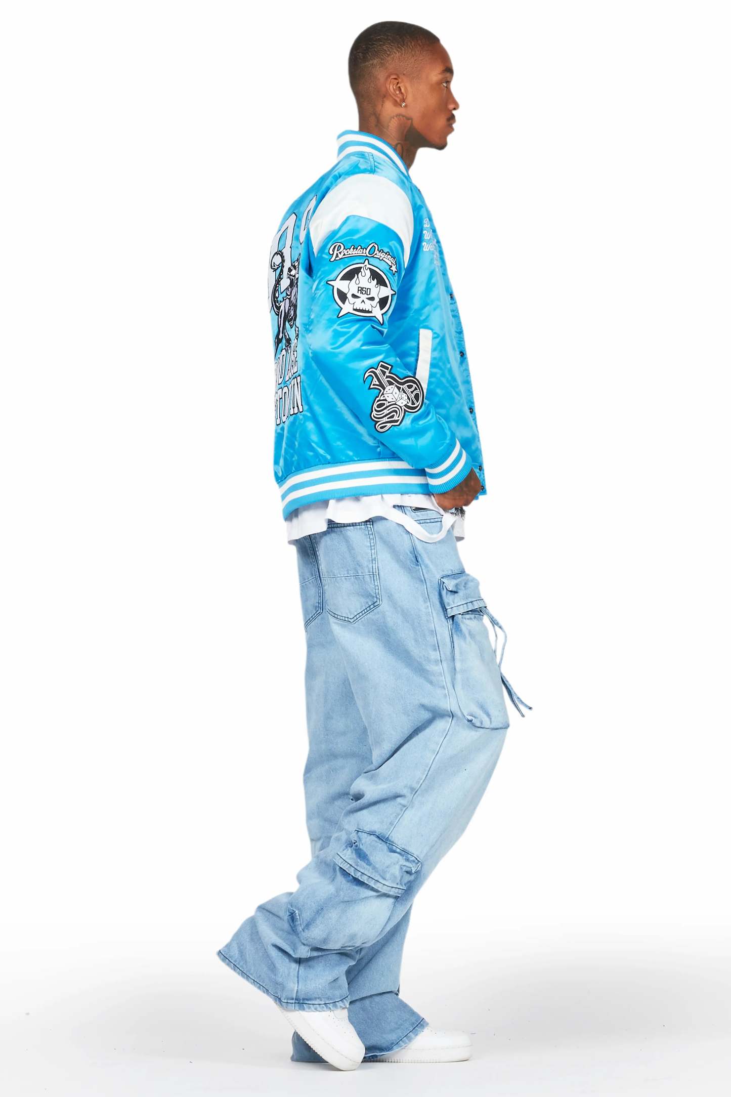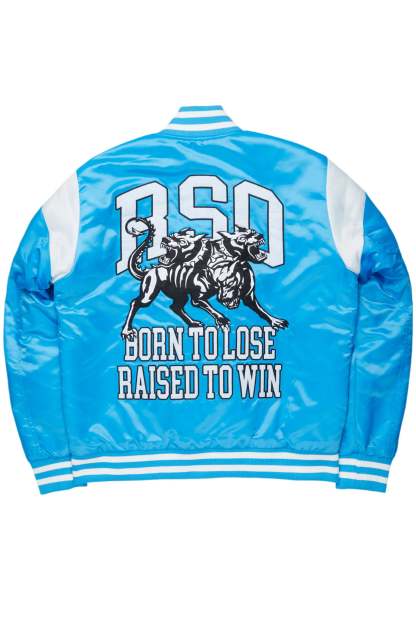 An urban collegiate varsity jacket for men in blue. Designed with custom detailing and quilted construction for a dope flight-jacket inspired layering piece.