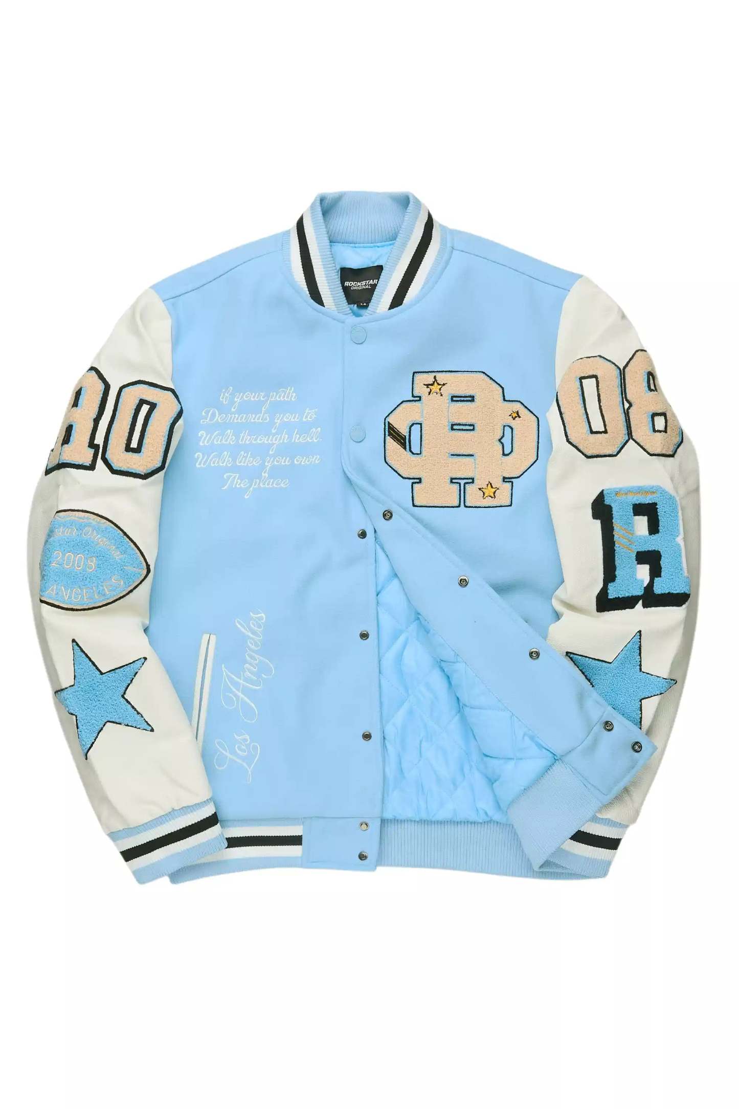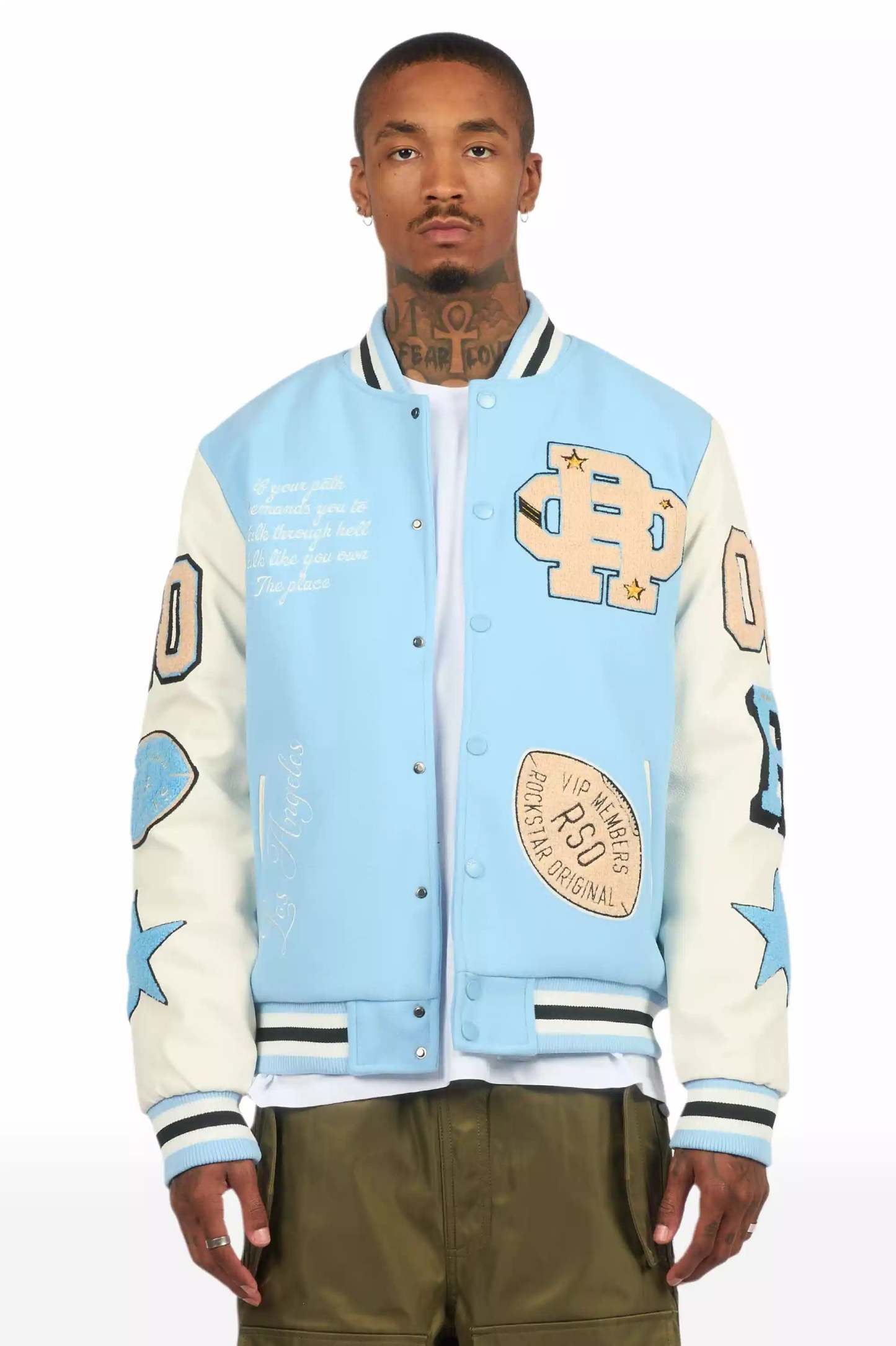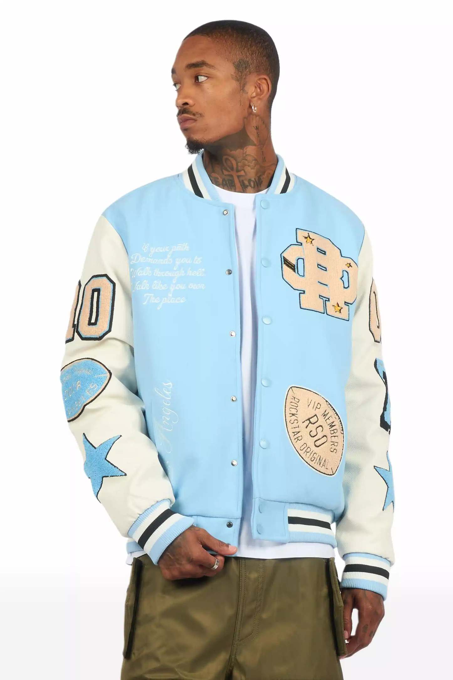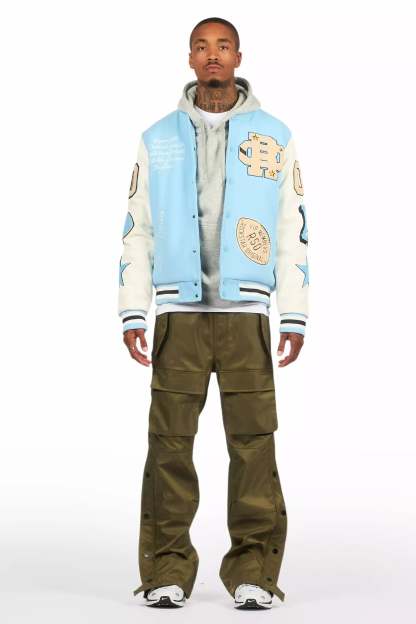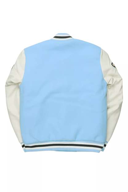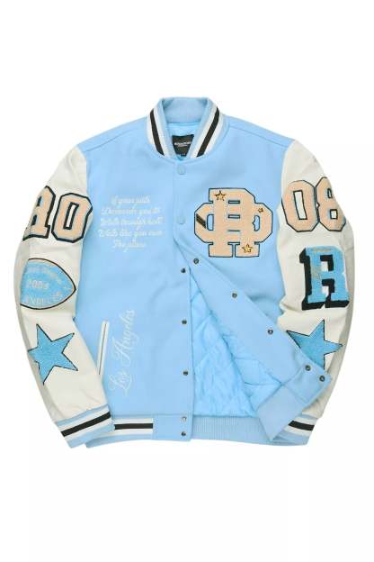 An urban collegiate varsity jacket for men in blue. Designed with an ultra soft fleece body and contrast faux leather sleeves for a dope outerwear style.