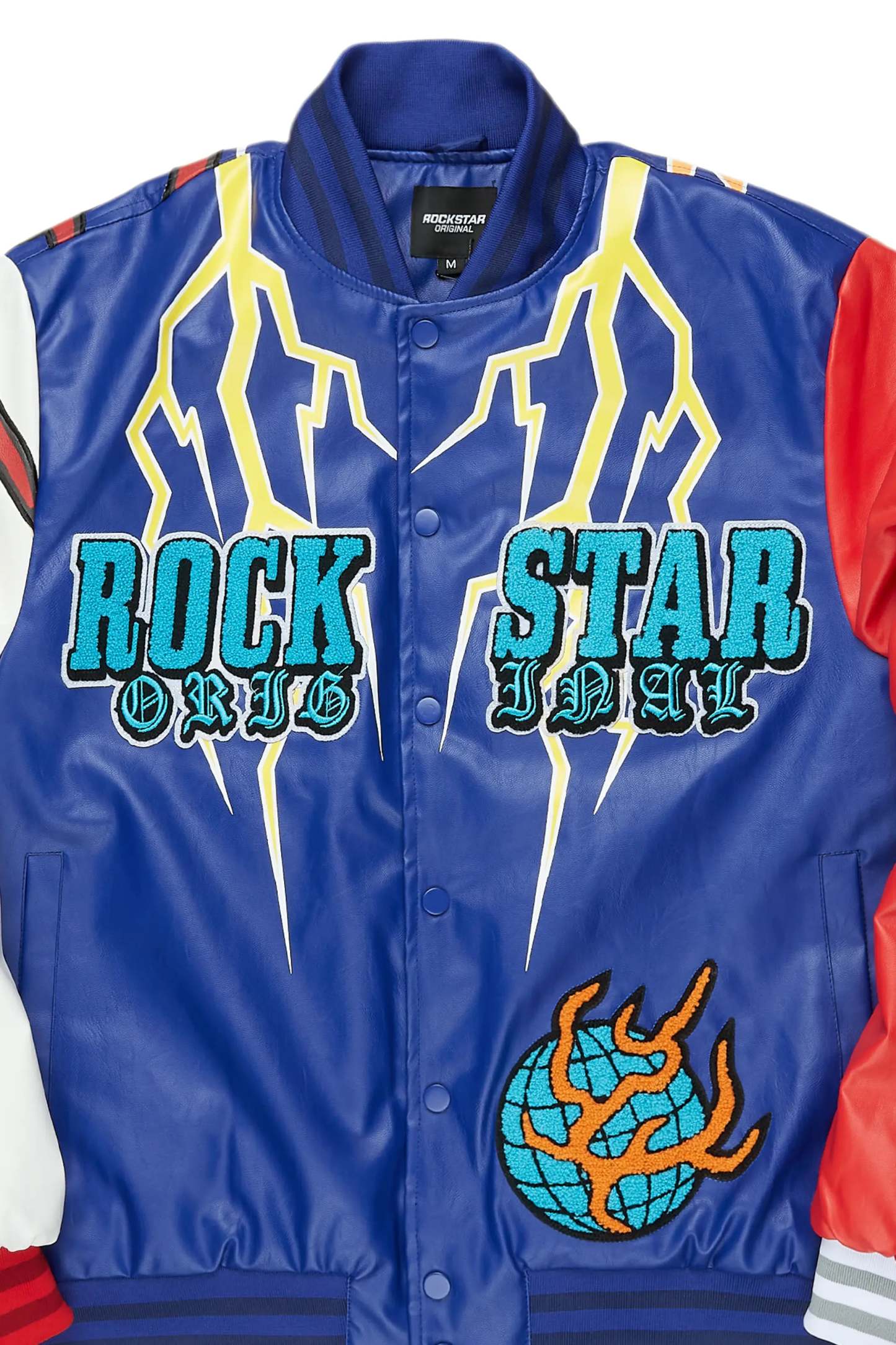 A custom quilted moto racer jacket for men in blue. Designed with premium PU faux leather fabric and color block detailing for a dope urban outerwear style.