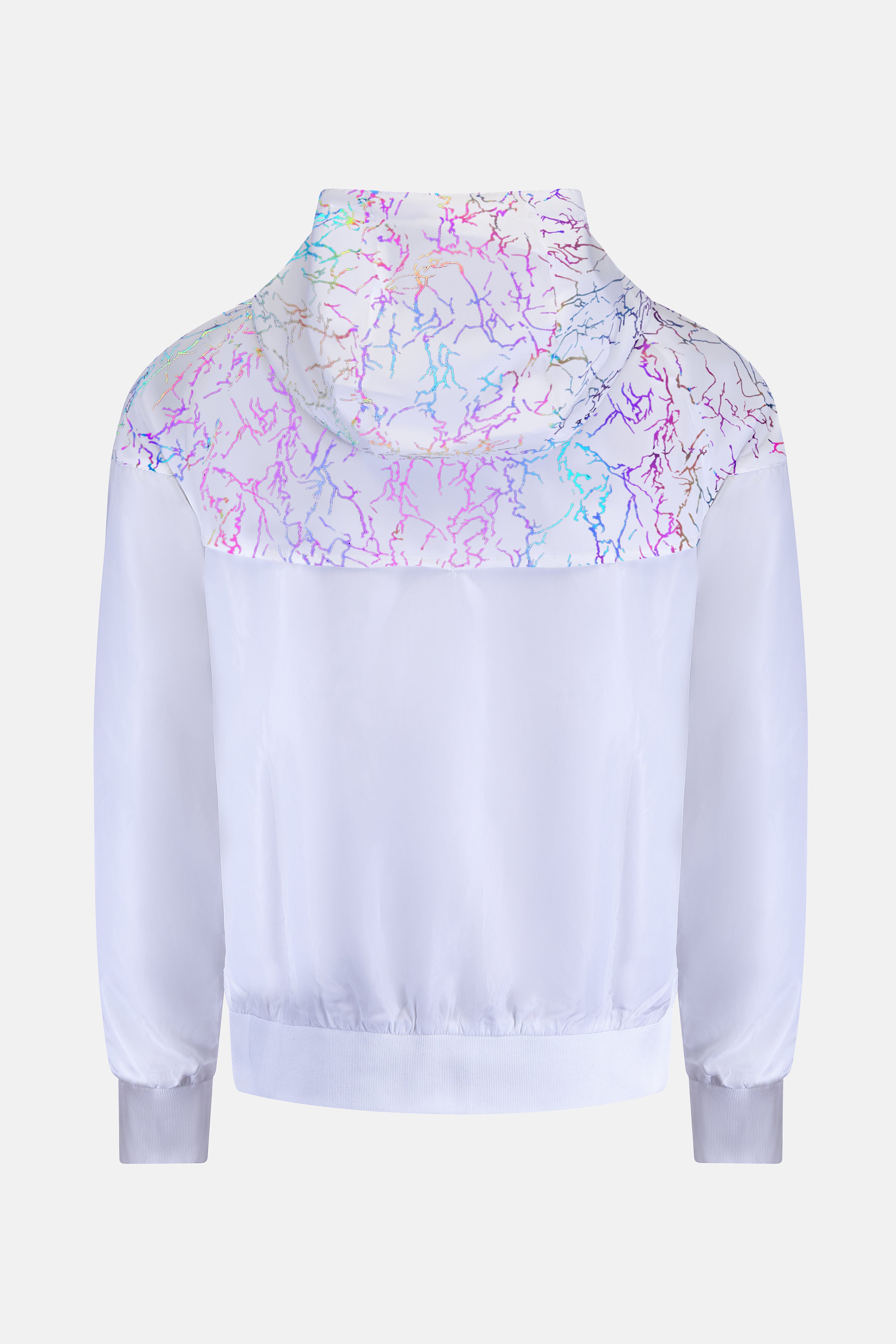 White Windbreaker featuring special lightning reflective fabric that shows pink/blue/orange/green/yellow colour under certain light and flash. Features Zoron rubber patch on left chest.