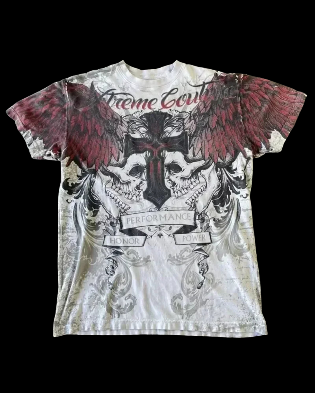 Vintage-white Xtreme Couture tee. Crimson feathered wings spreading across the shoulders, mirrored skulls around a black cross, and scroll banners reading Performance, Honor, and Power. Softly faded inks, baroque flourishes, and a broken-in drape. Cotton blend, true to size, and ready to ship.